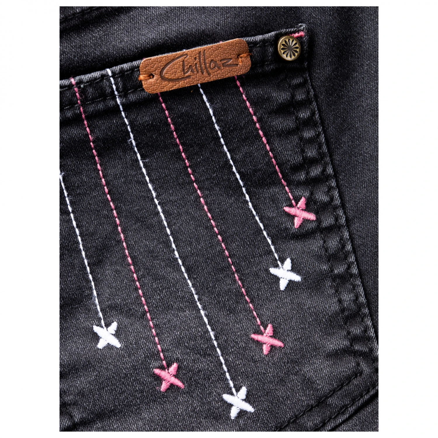 Mit der Jeanswaschung sowie den Stickereien an den Taschen schaut die Hose im Alltag schick aus. In den beiden Gesäß- und Fronttaschen findet sich Platz für den nötigen Kleinkram. Für einen sicheren Sitz der Hose kann bei Bedarf ein Gürtel angebracht werden.